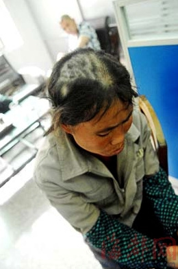 拾荒女是33岁的四川人谢某,身上穿着一套老旧的工作服,脚上的一双绿色布鞋已褪成灰绿色,鞋头开裂外翻,还打了几块黑色补丁。她的头发没过肩膀,但头顶上方却少了一片头发,碗口粗,十分显眼,手腕处则有好几道勒痕。